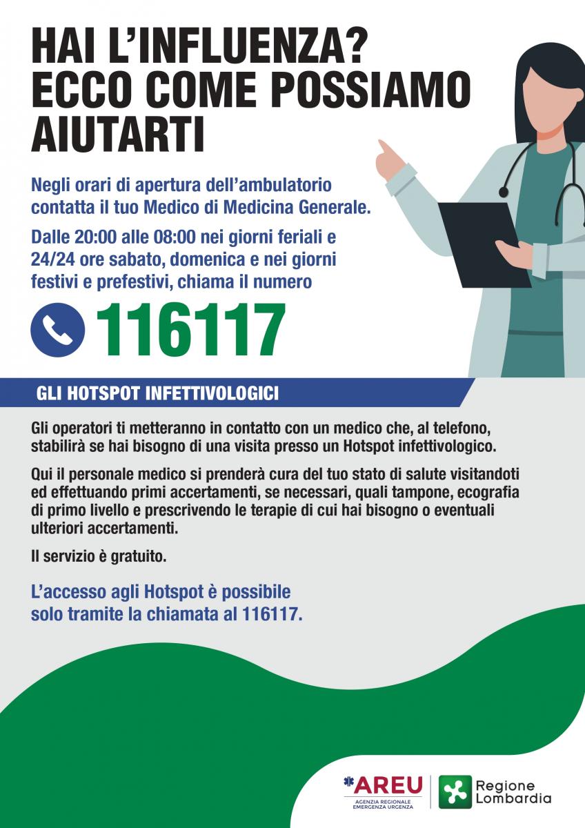 promozione del progetto Hotspot Infettivologico, patrocinato da Regione Lombardia, che si pone l’obiettivo di potenziare la Continuità Assistenziale territoriale e migliorare la gestione delle sindromi respiratorie virali durante i mesi invernali e offre un supporto sul territorio per i cittadini durante le fasce orarie in cui non è prevista l’attività ordinaria dei medici di medicina generale